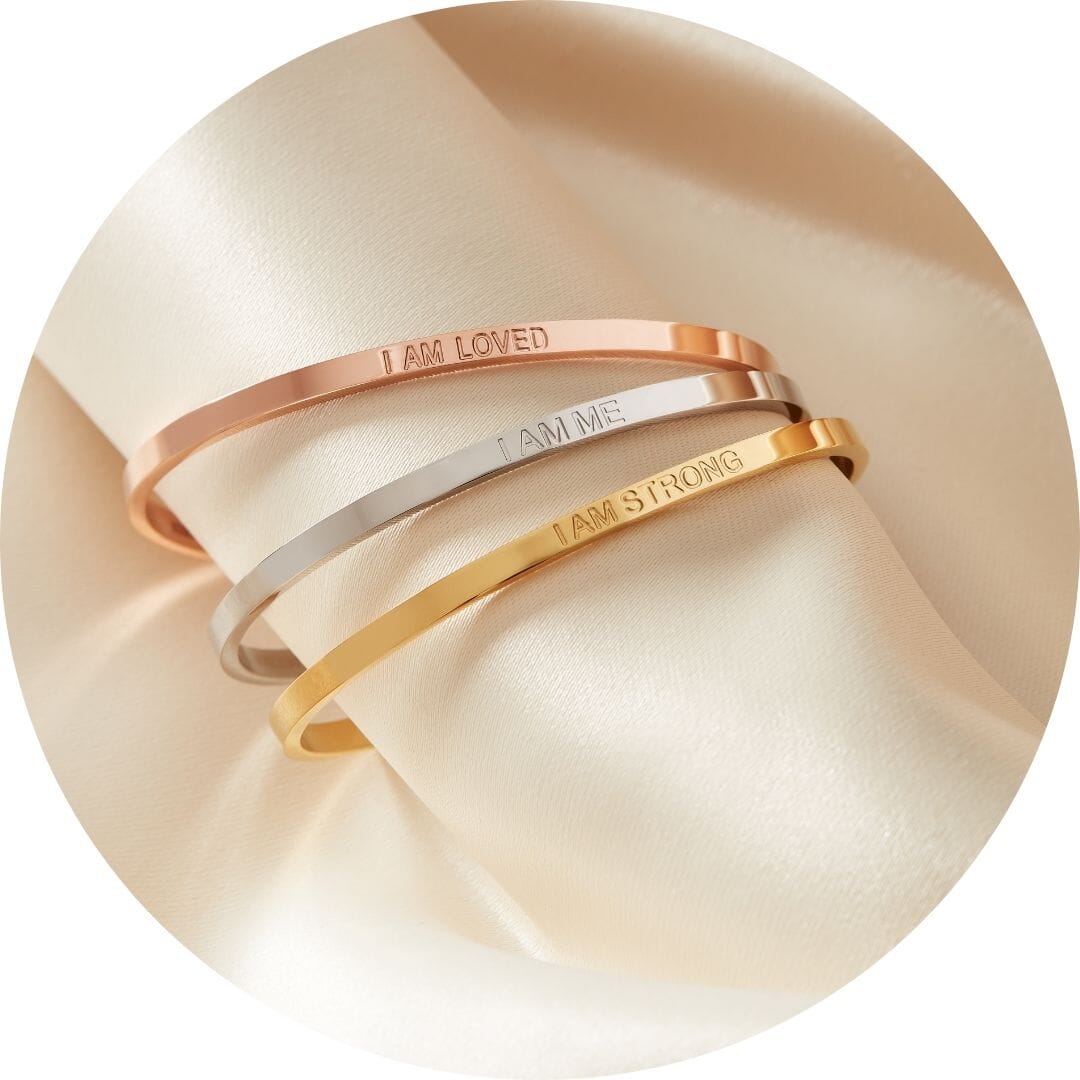 Three beautifully crafted bangles, each etched with gentle affirmations. Wear them stacked or solo – each one speaks directly to your worth, courage, and inner peace.