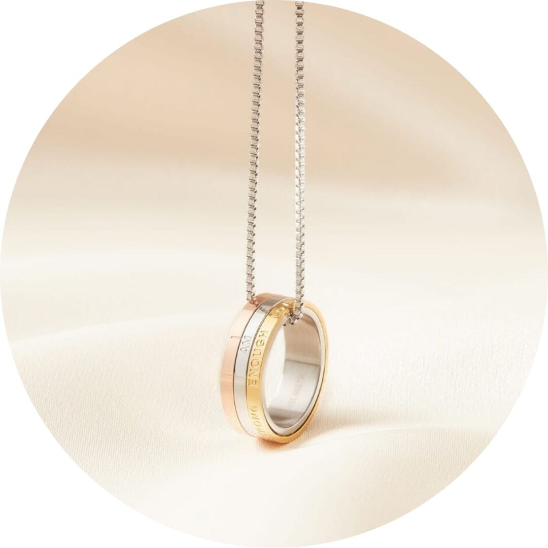 The Self-Soothing Spinner Necklace features a trio of rings — in gold, rose gold, and silver — suspended from a chain 45-50cm. Two fixed rings are engraved with I Am, while the third is a tactile spinner, etched with six powerful affirmations: